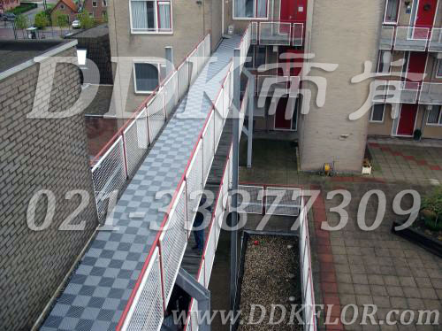 戶外風雨連廊地面由于無遮擋,全部或部分暴露于室外,屬于露天及半露天狀態,因此,雨水及冰雪極易在室外 走廊地面上形成滑倒摔傷的潛在人身安全!「帝肯(DDK)_8100_T500」走廊地板——這款防滑地材不同于一般傳統走廊地毯,它是專為露天連廊防止打滑的